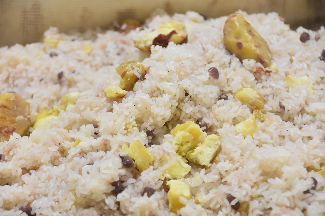 美濃加茂産手剥き栗入りのもちもちホクホク栗おこわ。1升よりご注文頂けます。